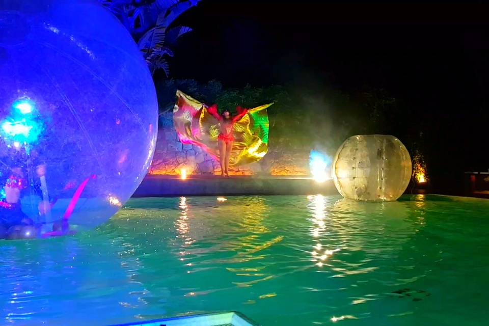 Un grande impatto visivo caratterizzato da una ballerina all’interno di una sfera trasparente che galleggia sull’acqua ed evoluzioni di danza artistica e giocoleria di fuoco, arricchiti da effetti e colpi di scena.